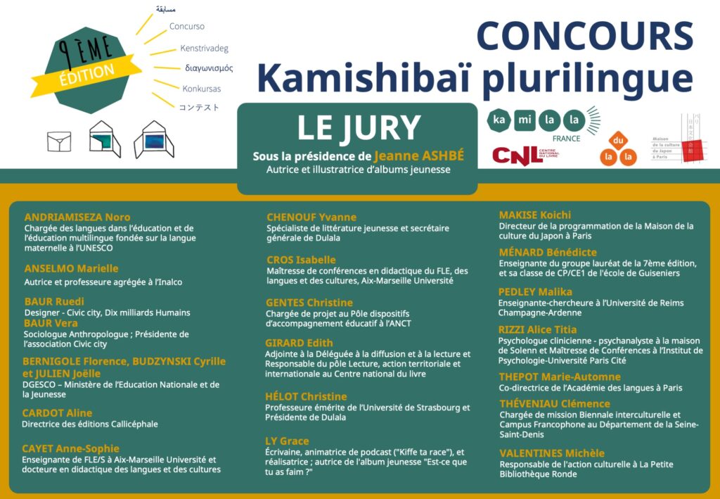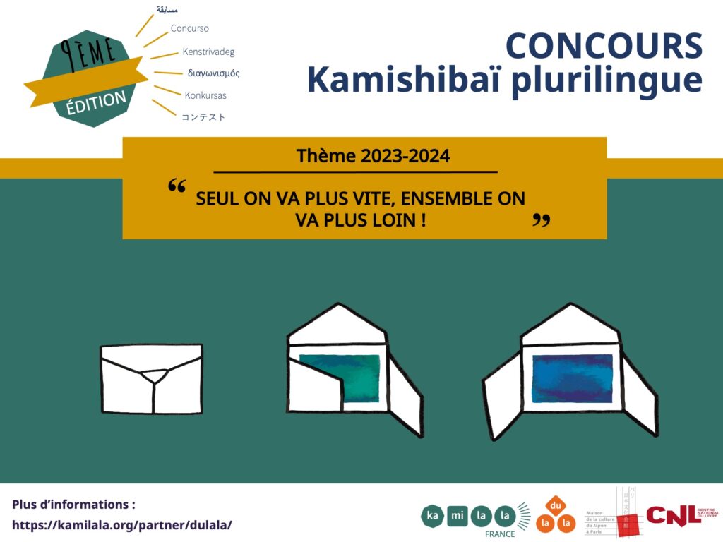Dulala est un pôle national de ressources et de formation sur le bilinguisme et l’éducation plurilingue. Elle est à l’origine du Concours Kamishibaï plurilingue, lancé depuis 2015, qui concerne les structures éducatives en France métropolitaine et dans les DROM-COM. Par ailleurs, l’association coordonne également le réseau Kamilala depuis la France. Le concours s’adresse aux acteurs éducatifs (enseignant.e.s, acteurs associatifs, bibliothècaires, animateurs…) travaillant avec des enfants âgés de 0 à 15 ans. Un jury aura la charge d’élire 4 lauréats : un kamishibaï lauréat pour chaque tranche d’âge (3-6 ans, 6-10 ans et 10-15 ans) ainsi qu’un coup de cœur. Le jury est composé de professionnels aux points de vue très variés, issus de l’éducation, de l’illustration, de l’édition, de la culture japonaise et bien sûr du plurilinguisme.
